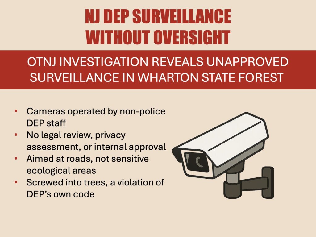 OTNJ supports responsible stewardship of our forests. But this is surveillance without rules — and it violates the same policies the DEP enforces on the public.